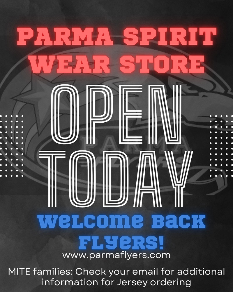 The Parma Hockey Spirit Wear Store is officially OPEN for the start of season! Today through September 7, gear up with all the essentials: game jerseys, socks, hoodies, tees, and more to rock your Parma pride in style.